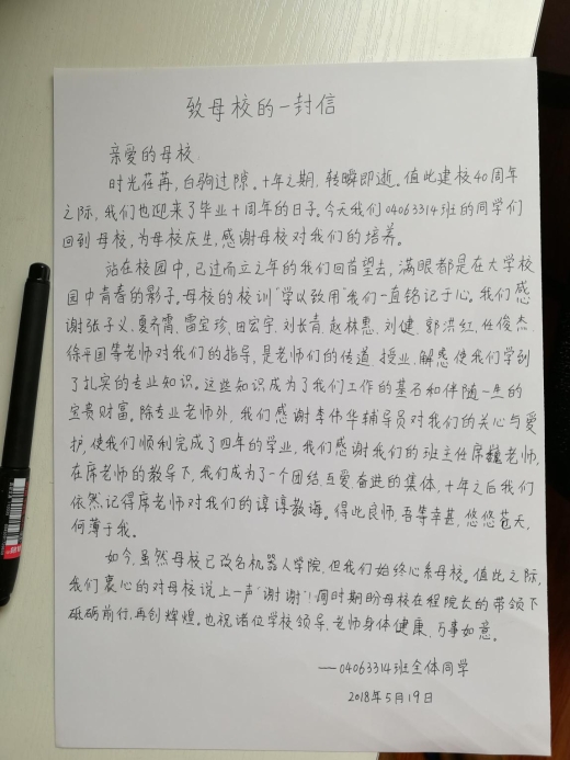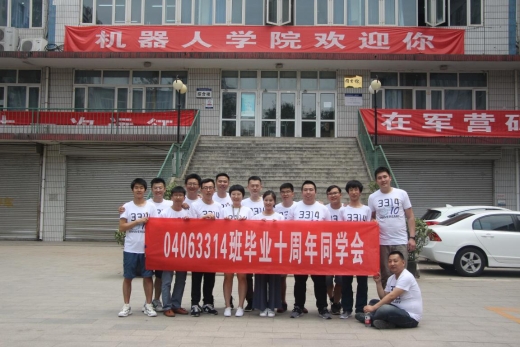 2018年5月19日,机器人学院2004级04063314班15名同学在校庆40年、毕业十周年之际重回母校,开展毕业十周年同学会活动。他们身着精心设计的班服,在校园、操场、教室重温难忘的校园时光,他们与当时的任课老师亲切交谈,他们由衷祝福母校办学40周年,感恩学院的培养,并给学院赠送了锦旗和感谢信。